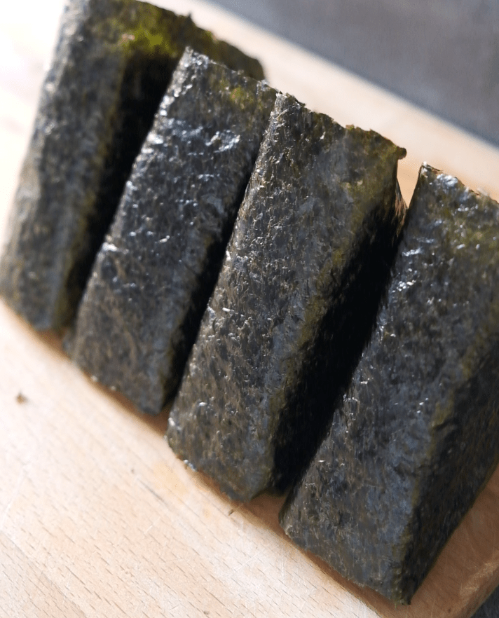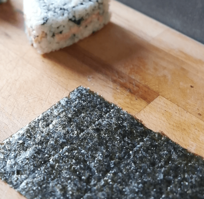 Chiudi il riso attorno al ripieno, formando un triangolo, e avvolgilo con un foglio di alga Nori. Questa parte può sembrare complicata all’inizio, ma con un po’ di pratica diventerà facilissima!