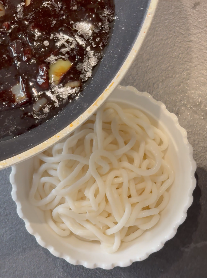 Bollire 400g noodles jjajangmyeon in acqua salata 5-7 minuti fino al dente. Scola e mescola subito con la salsa calda per amalgamare.
