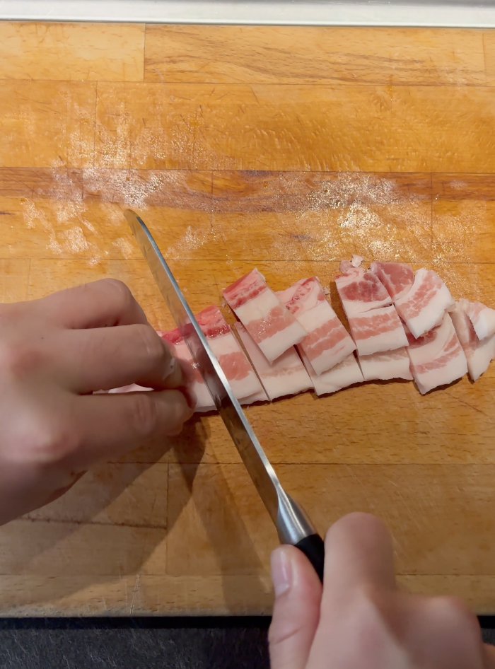 Trita 200g maiale, oppure seziona della pancetta, 2 cipolle, 1 patata e 1 zucchina a dadini. Prepara tutto vicino al fornello per un flusso di lavoro veloce.