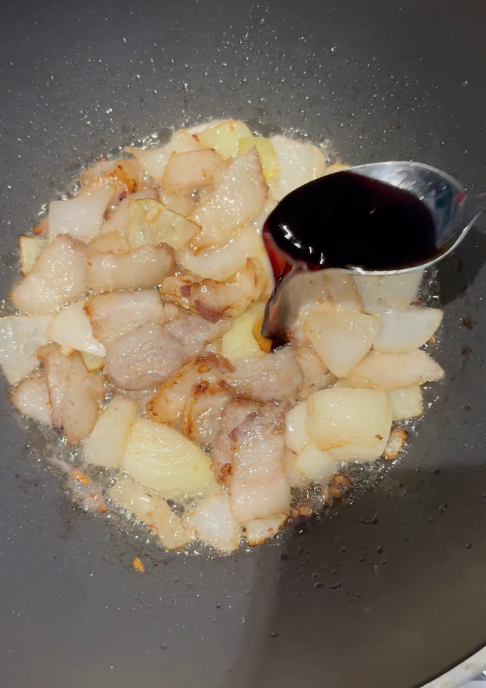 In un wok con olio ben caldo, rosola il maiale fino a dorarlo.