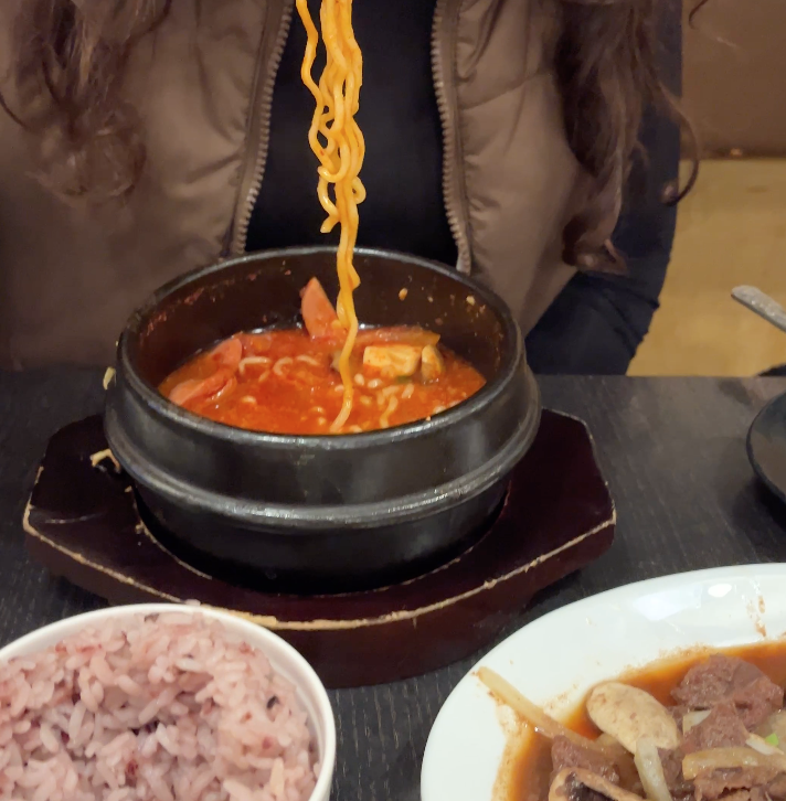 •Budae Jjigae (Army Stew): Questo stufato “dell’esercito” è un vero comfort food coreano. La versione del Bapbo, ricca di spam, salsiccia, tofu, ramen e verdure, era bollente, saporita e incredibilmente appagante. Non a caso è uno dei piatti più apprezzati del locale. Il brodo speziato e profondo ci ha riscaldato il cuore in una fredda serata torontina.