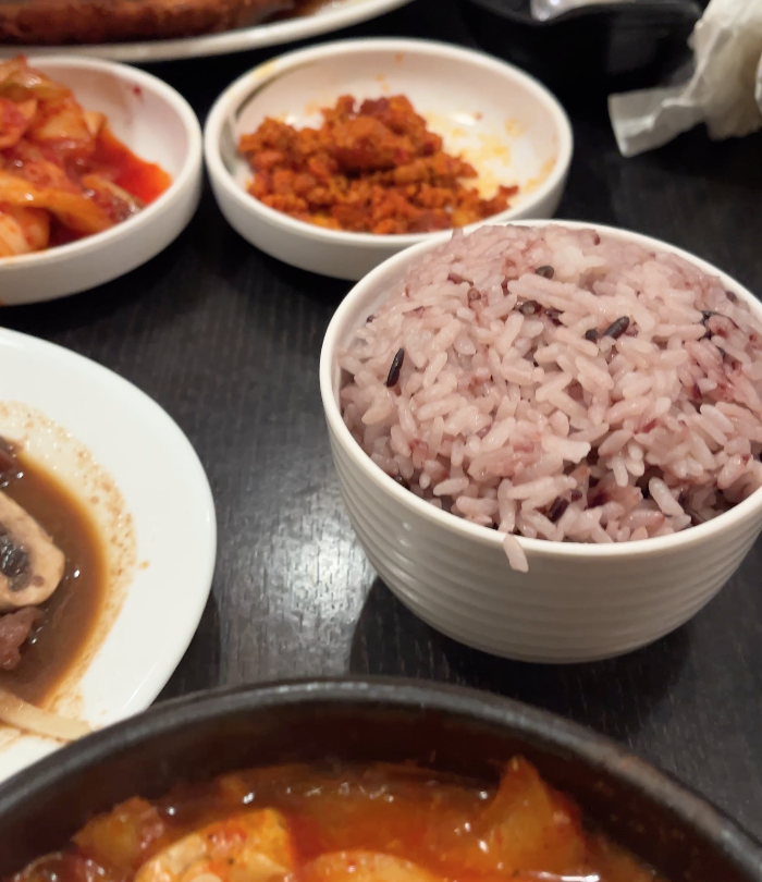Un aspetto che ci ha colpito positivamente è stato il riso di colore viola, un tocco distintivo che indica l’uso di cereali misti, rendendo il pasto non solo più salutare ma anche visivamente interessante. I banchan che accompagnavano i nostri piatti, come il Kimchi, l’Odeng bokkeum (fishcake) e il Gyeran Jangjorim (uova sode in salsa di soia), erano freschi e deliziosi, perfetti per bilanciare i sapori principali.