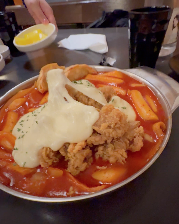 •Tteokbokki con pollo fritto e mandu: Per gli amanti del piccante e delle consistenze, i Tteokbokki sono irrinunciabili. Al Bapbo, abbiamo optato per una versione che combinava la morbidezza degli gnocchi di riso in salsa piccante con la croccantezza del pollo fritto e la sapidità dei mandu (ravioli coreani). Un abbinamento vincente che ha creato un contrasto di sapori e texture davvero memorabile. Il menu chiama questo piatto “Cheesefall Chicken Tteokbokki”.